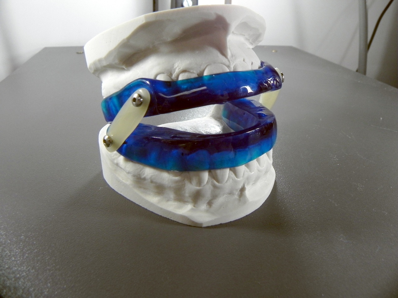 Eine Schnarcher-Schiene oder Schnarch Spange hält den Unterkiefer vorne, so dass er nicht nach hinten fallen kann und sich hierdurch der Rachen verschliessen kann. So wird Schnarchen und Schlafapnoe verhindert. Diese Schienen werden auch Unterkieferprotrusionsschienen genannt.